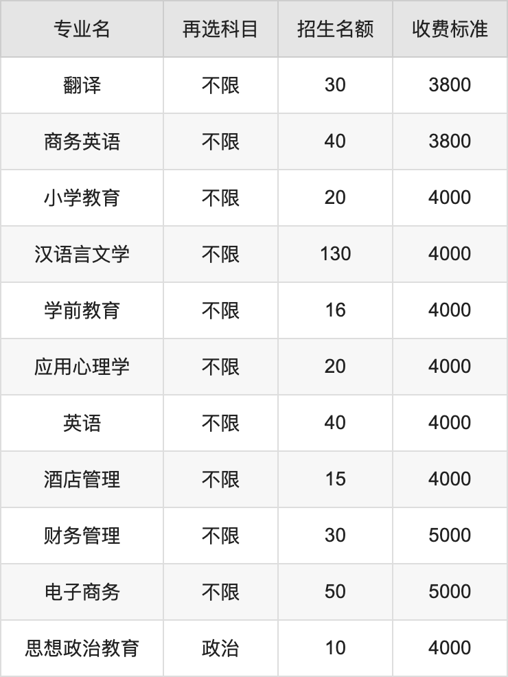 长沙师范学院在历史组本科批招生的各个专业,每年的学费是3800元-5000元。招生人数最多的专业是汉语言文学,2024年招130人,学费是4000元。