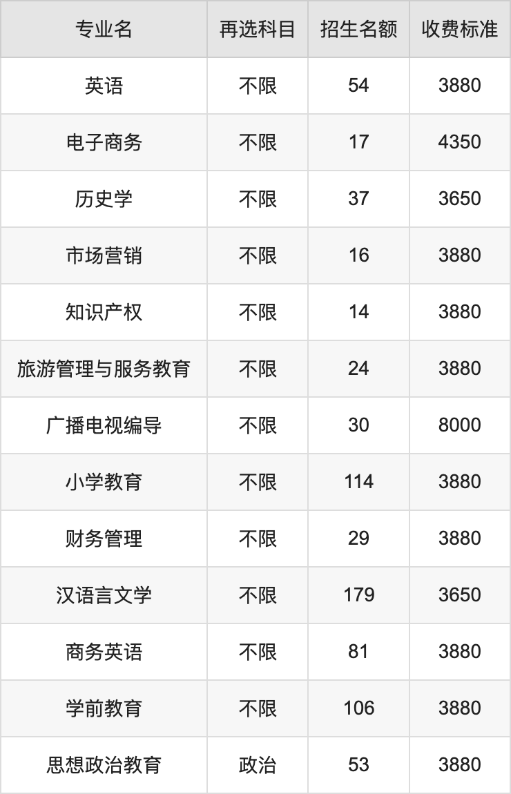 萍乡学院在历史组本科批招生的各个专业,每年的学费是3650元-8000元。招生人数最多的专业是汉语言文学,2024年招179人,学费是3650元。