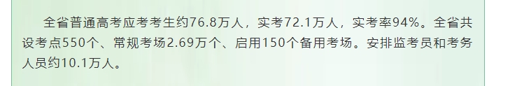 全省普通高考应考考生约76.8万人,实考72.1万人,实考率94%。全省共设考点550个、常规考场2.69万个、启用150个备用考场。安排监考员和考务人员约10.1万人。