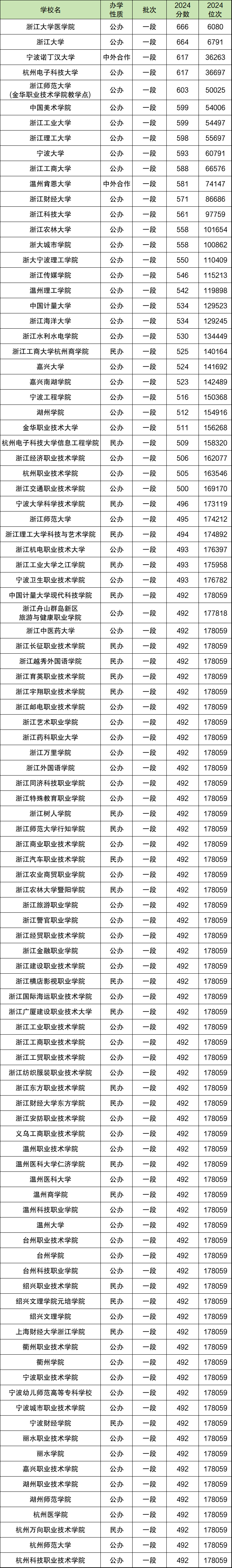 2024年浙江一段各大学中,分数线最低、最好考的院校是杭州师范大学、杭州科技职业技术学院等64所,2023年录取分数492分,录取位次178059位。