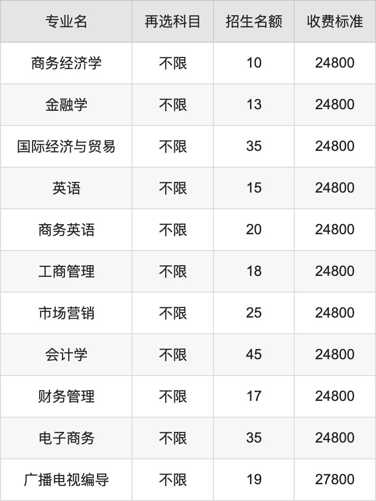| 本科批 | 历史 | 商务经济学 | 10 |