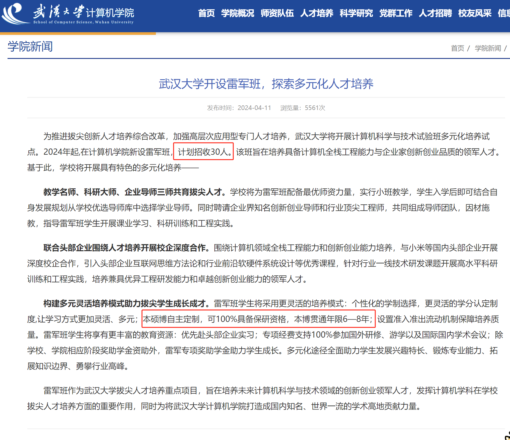 综上所述,武汉大学雷军班作为该校拔尖人才培养的重点项目之一,具有独特的办学模式和卓越的教育资源。虽然招生名额有限且录取分数线较高,但对于有志于从事计算机领域相关科学研究和创新创业的考生而言,仍然是一个值得期待的选项。