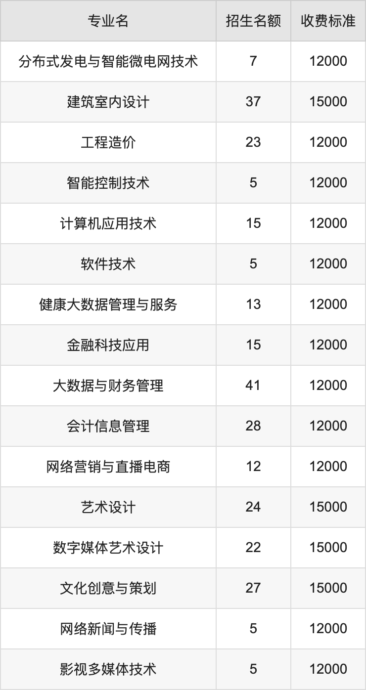 银川科技学院在文科高职专科批招生的各个专业,每年的学费是12000元-15000元。招生人数最多的专业是大数据与财务管理,2024年招41人,学费是12000元。