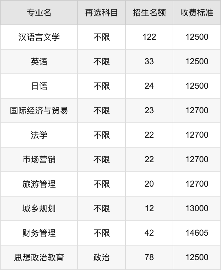 湖南文理学院芙蓉学院在历史组本科批招生的各个专业,每年的学费是12500元-14605元。招生人数最多的专业是汉语言文学,2024年招122人,学费是12500元。
