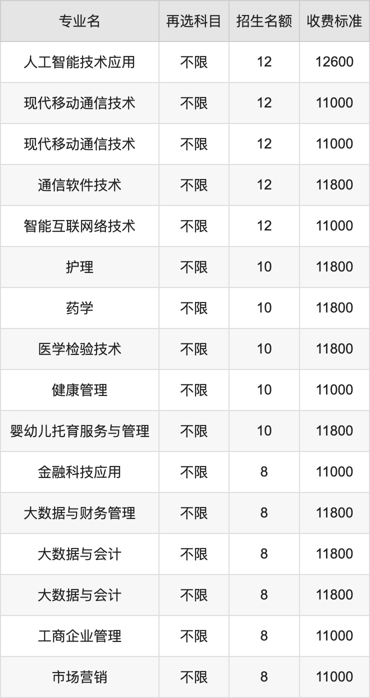 石家庄科技信息职业学院在历史组专科批招生的各个专业,每年的学费是11000元-12600元。招生人数最多的专业是计算机网络技术,2024年招14人,学费是12600元。