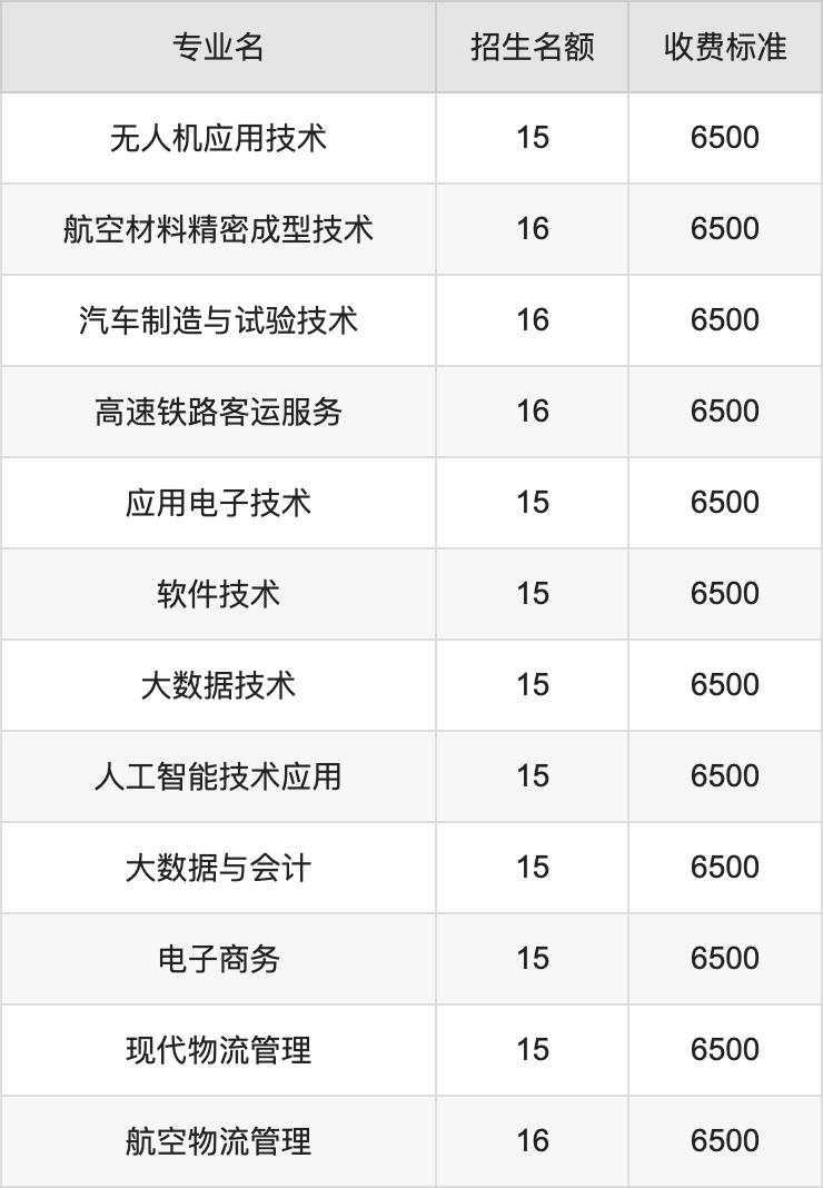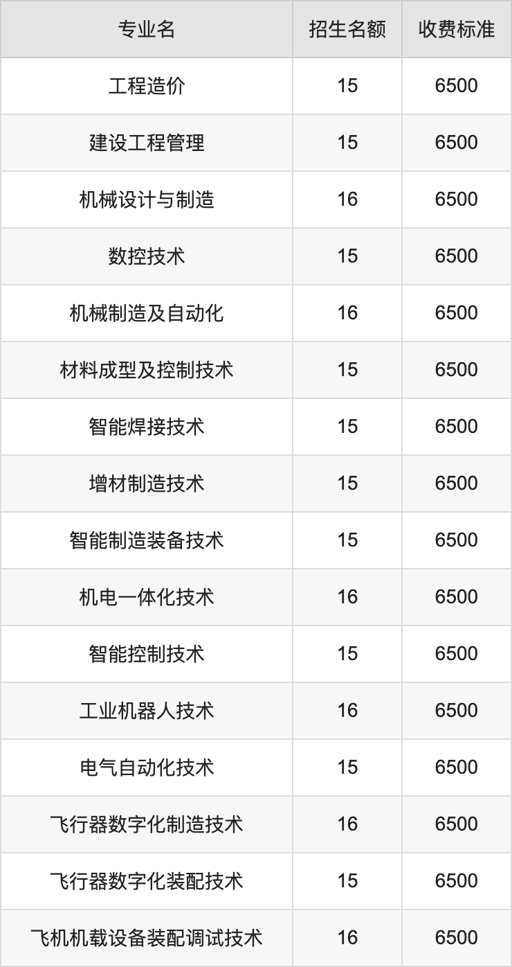 陕西航空职业技术学院在文科高职专科批招生的各个专业,每年的学费是6500元。招生人数最多的专业是机械设计与制造,2024年招16人,学费是6500元。