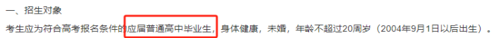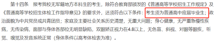 | 空军军医大学 | 报考无军籍地方本科生的考生须为普通高中应届生 |