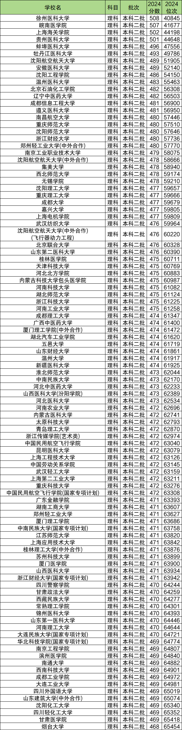 实力比较强的二本大学有河北医科大学、河南农业大学、江苏师范大学、广西医科大学、西北师范大学。2024年全国公办二本大学理科录取分数线408分到508分、文科录取分数线433分到502分,各校最低分及位次排名如下。