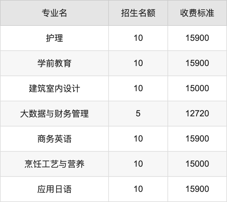 四川国际标榜职业学院在文科专科批招生的各个专业,每年的学费是12720元-15900元。招生人数最多的专业是护理,2024年招10人,学费是15900元。