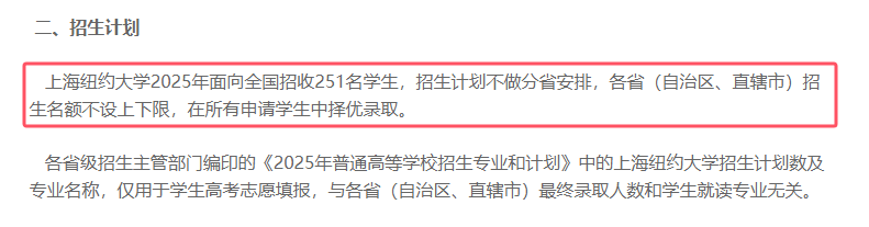 以上海纽约大学为例,2025年上海纽约大学面向全国31个省市区进行综评招生,招生计划数共计251人,计划不分省安排,各省的招生名额也不设上下限。