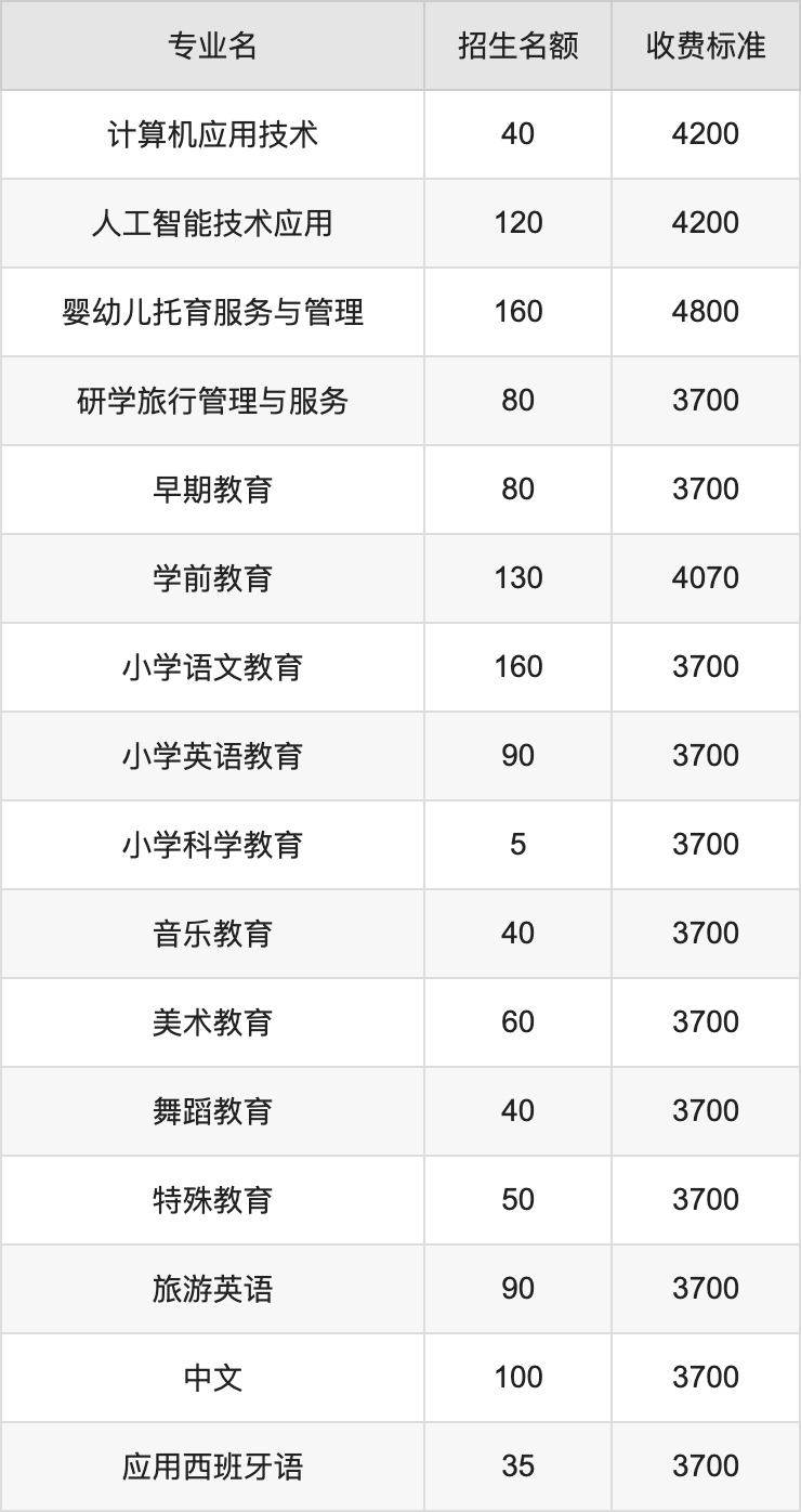 郑州幼儿师范高等专科学校在文科高职高专批招生的各个专业,每年的学费是3700元-4800元。招生人数最多的专业是婴幼儿托育服务与管理,2024年招160人,学费是4800元。
