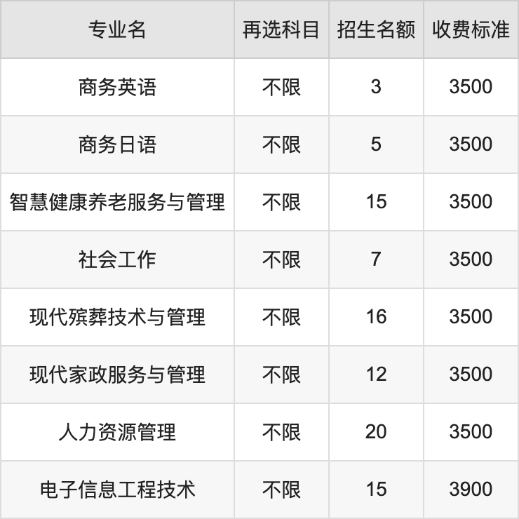 | 高职专科批 | 历史 | 现代殡葬技术与管理 | 16 |