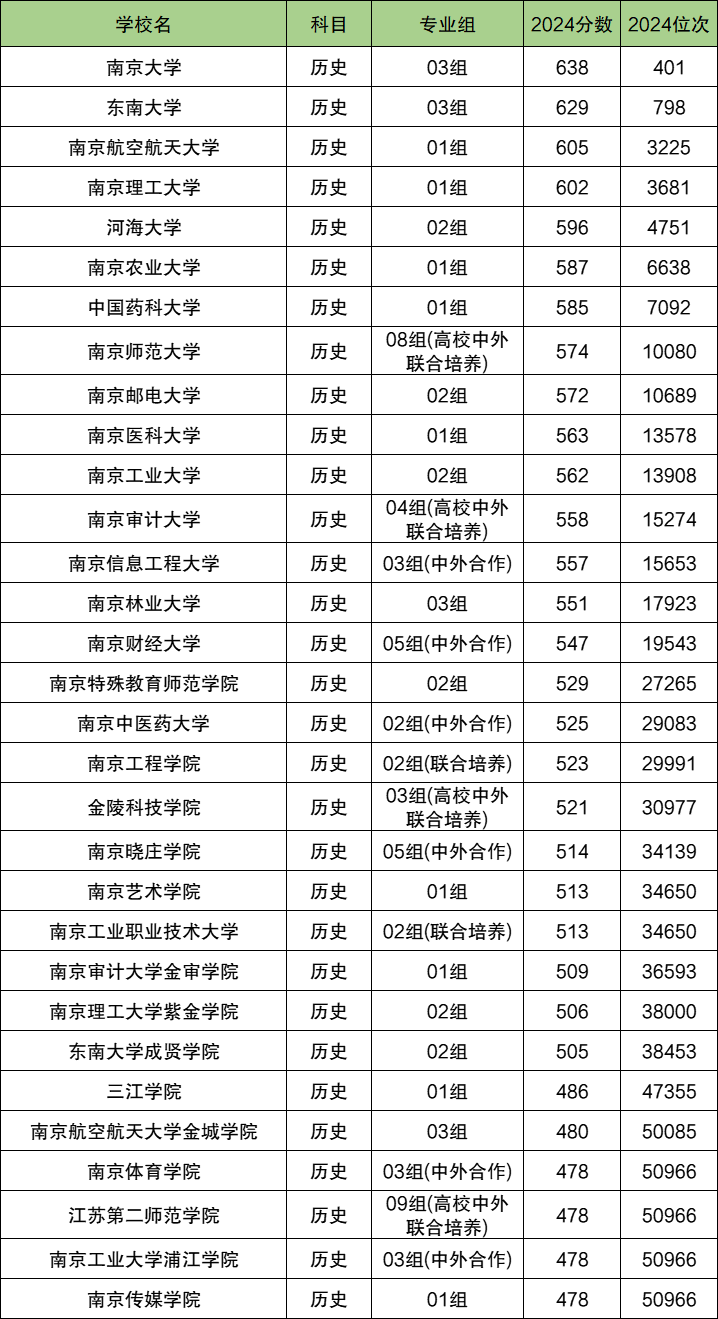 2024年南京本科各大学中,在历史类分数线最高、最难考的院校是南京大学(03组),2024年录取分数638分,录取位次401位;