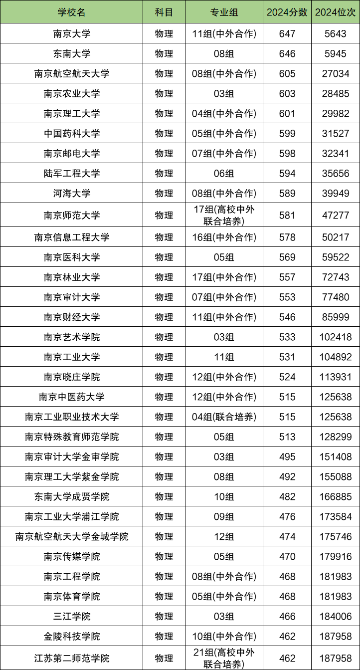 2024年南京本科各大学中,在物理类分数线最高、最难考的院校是南京大学(11组中外合作),2024年录取分数647分,录取位次5643位;
