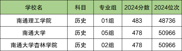 2024年南通本科各大学中,在历史类分数线最高、最难考的院校是南通理工学院(01组),2024年录取分数483分,录取位次48736位;