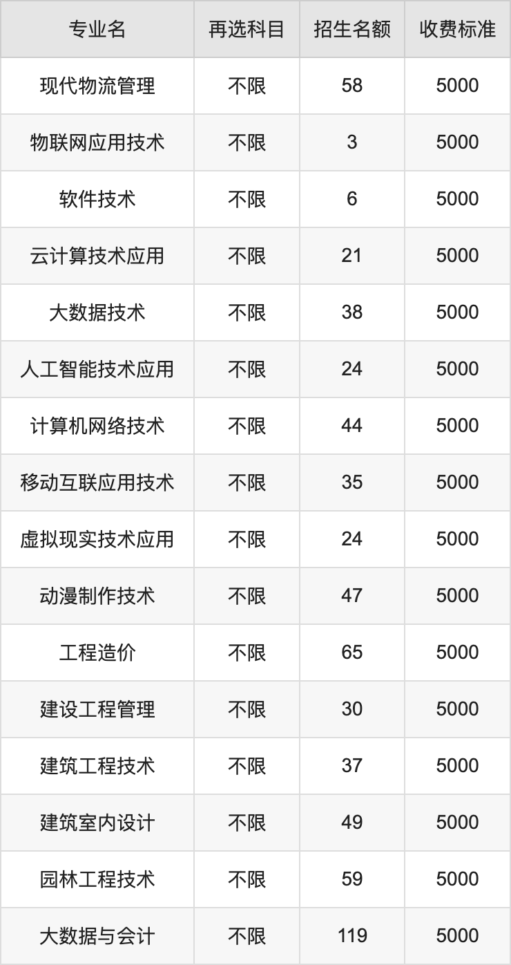 江西职业技术大学在历史组高职专科招生的各个专业,每年的学费是5000元-12000元。招生人数最多的专业是大数据与会计,2024年招119人,学费是5000元。