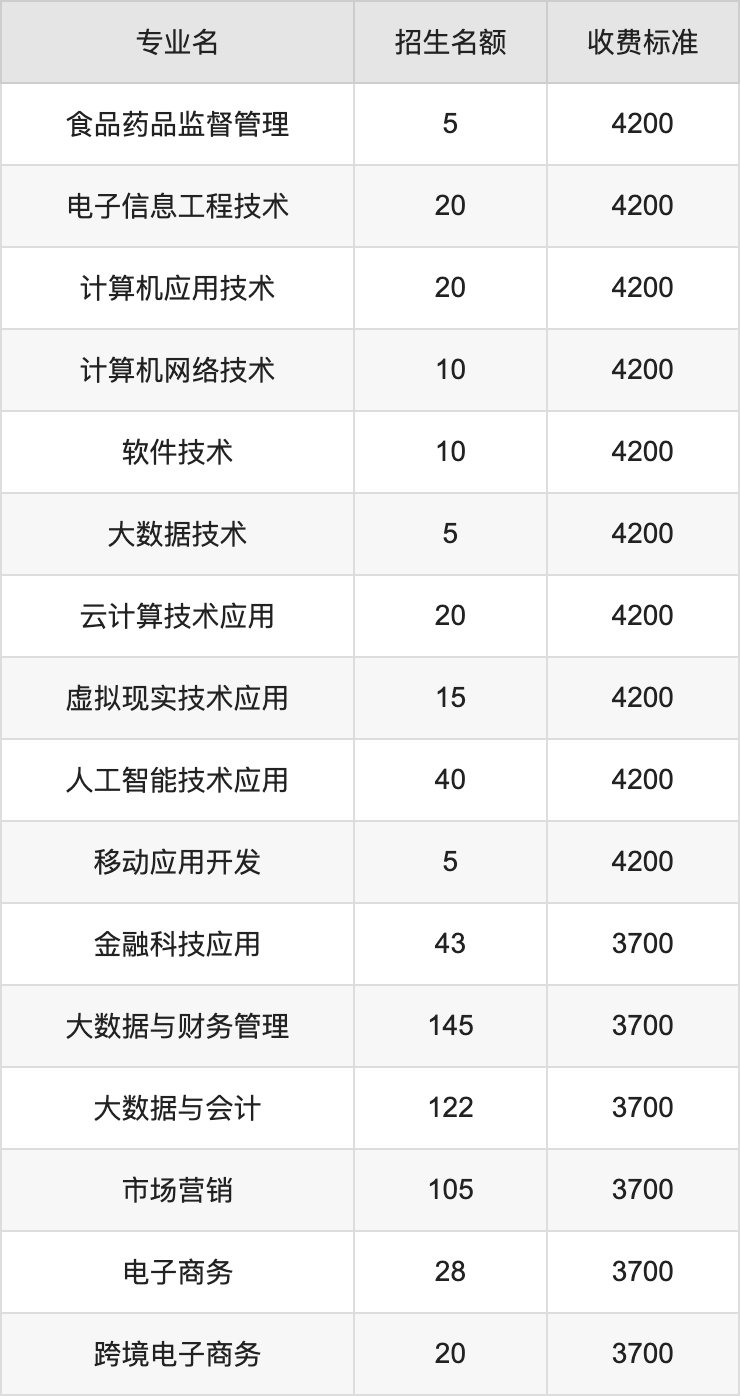 河南轻工职业学院在文科高职高专批招生的各个专业,每年的学费是3700元-4200元。招生人数最多的专业是大数据与财务管理,2024年招145人,学费是3700元。