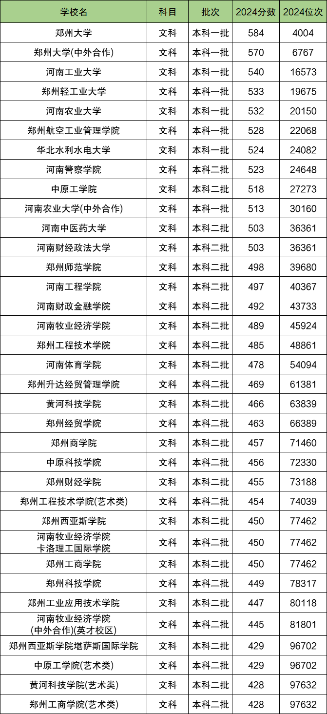 2024年郑州本科各大学中,在文科类分数线最高、最难考的院校是郑州大学,2024年录取分数584分,录取位次4004位;