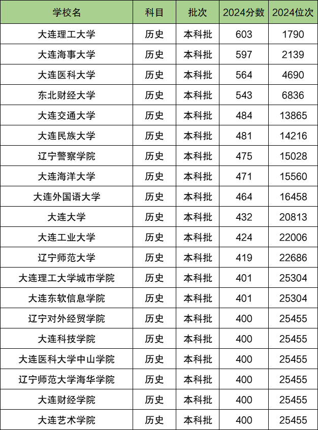 2024年大连本科各大学中,在历史类分数线最高、最难考的院校是大连理工大学,2024年录取分数603分,录取位次1790位;