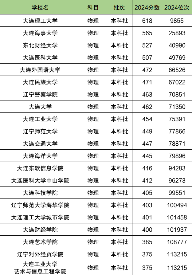 2024年大连本科各大学中,在物理类分数线最高、最难考的院校是大连理工大学,2024年录取分数618分,录取位次9855位;