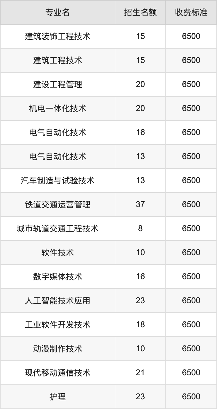 铜川职业技术学院在文科高职专科批招生的各个专业,每年的学费是6500元。招生人数最多的专业是铁道交通运营管理,2024年招37人,学费是6500元。