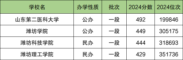 2024年潍坊本科各大学中,分数线最高、最难考的院校是山东第二医科大学,2024年录取分数492分,录取位次199846位;