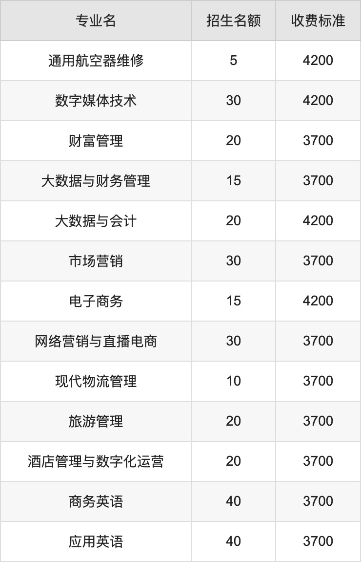 河南工业职业技术学院在文科高职高专批招生的各个专业,每年的学费是3700元-4800元。招生人数最多的专业是商务英语,2024年招40人,学费是3700元。