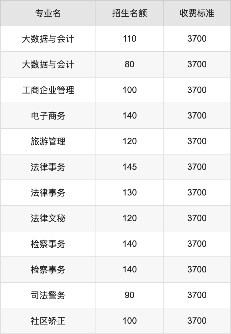 河南检察职业学院在文科高职高专批招生的各个专业,每年的学费是3700元。招生人数最多的专业是法律事务,2024年招145人,学费是3700元。