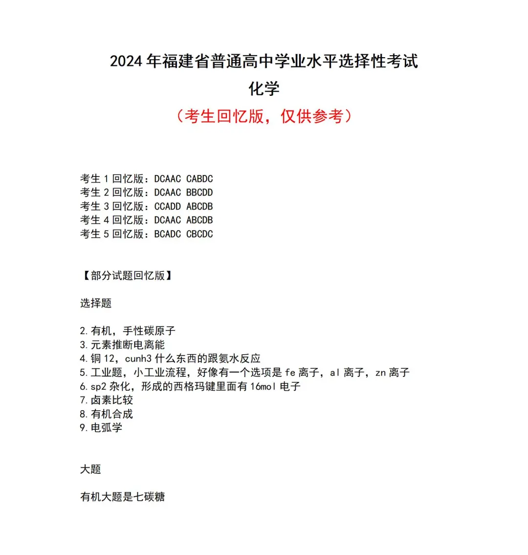 试卷答案:小灯塔将在考后及时发布2024年福建高考化学、生物、政治、地理试卷及答案,请同学们以平和、自信的心态耐心等待答案的出炉。