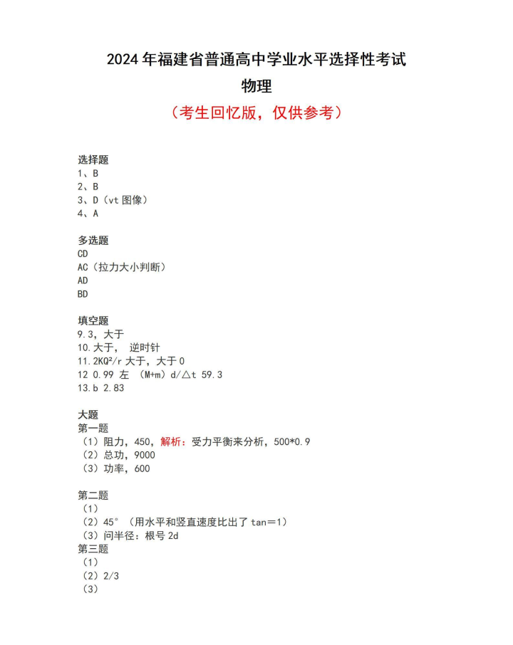 试卷答案:关于2024福建高考物理/历史试卷及答案,小灯塔将在考试结束后的第一时间上传,请大家稍等片刻。