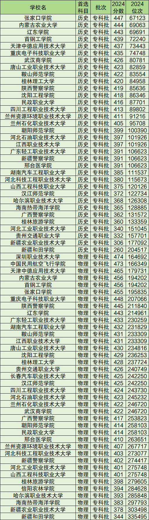 含专科的本科院校有张家口学院、民政职业大学、朝阳师范学院、邢台医学院、沈阳工程学院等,录取最低分历史类是260分(新疆和田学院)、物理类是344分(新疆和田学院)。