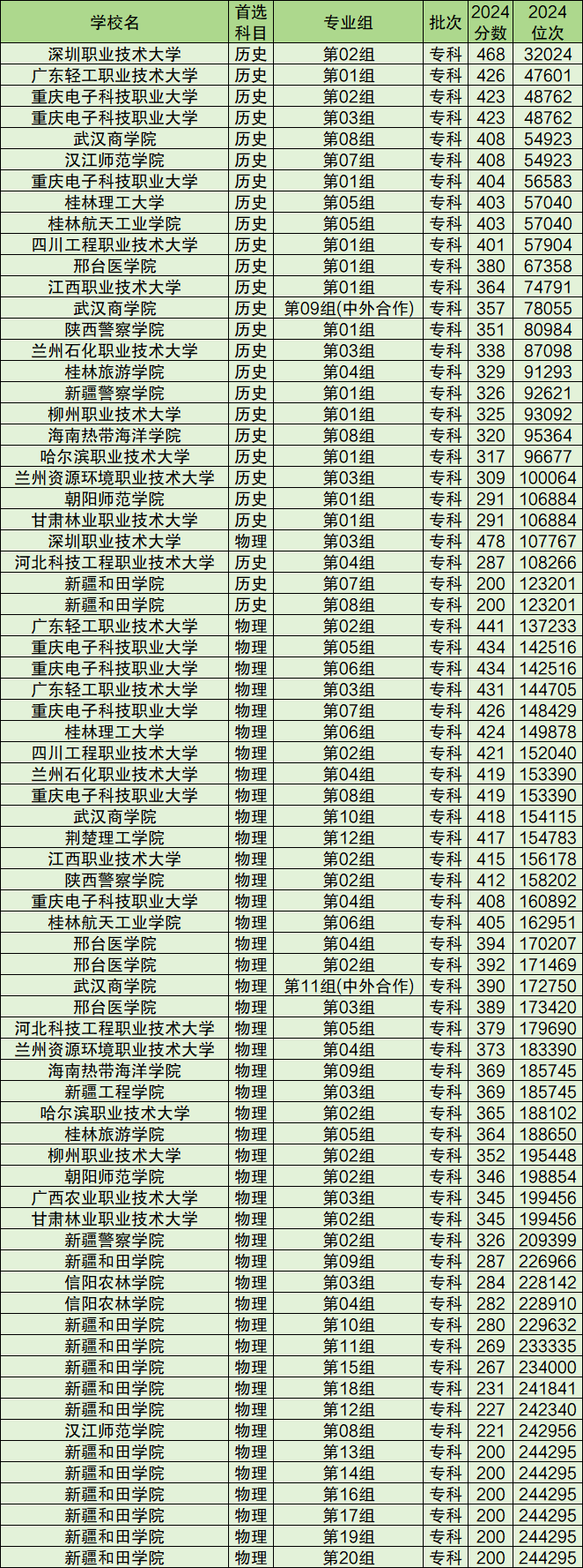 2024年在该地招专科专业的公立本科院校有武汉商学院、桂林理工大学、新疆和田学院等,其中同学们最难考上的是深圳职业技术大学(历史类第02组445分、物理类第03组478分)。