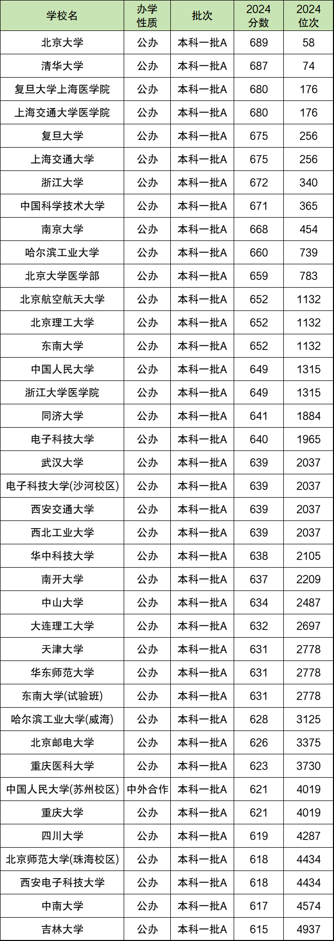 山西理科1-5000名对应的大学一共有39所,在此范围内,最高位次对应的大学是北京大学,最低录取位次为58位,位次对应分数为689分;