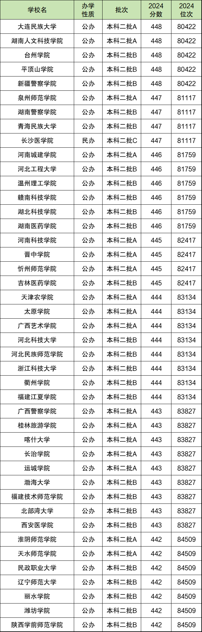 山西理科8万-8.5万名对应的大学一共有43所,在此范围内,最高位次对应的大学是大连民族大学、湖南人文科技学院等5所院校,最低录取位次为80422位,位次对应分数为448分;