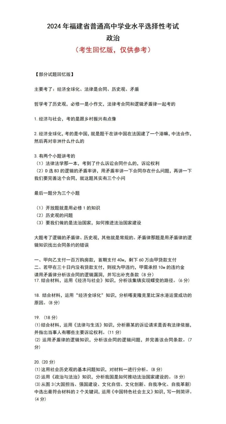 高考政治试卷答案:2024福建高考政治答案及试题将在考后上传至此处,请同学们保持关注,以便获取最新信息,及时了解自己的答题表现。