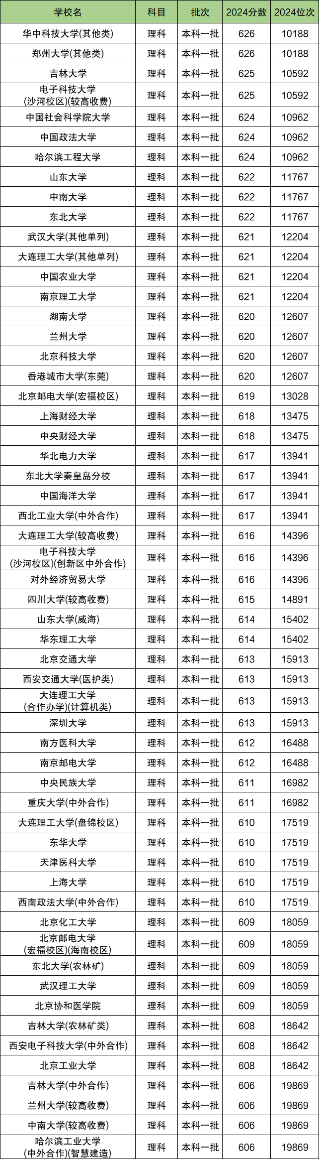 下表为2024年在河南理科中分数位次在1万-2万名的全部大学。
