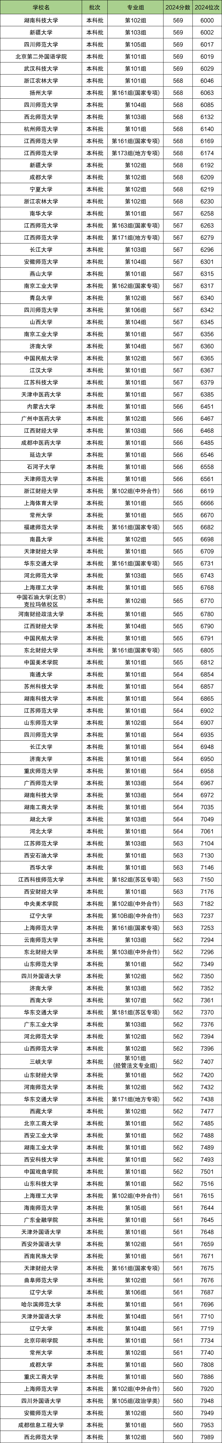 下表为2024年江西历史类分数位次在6千-8千名的全部大学。