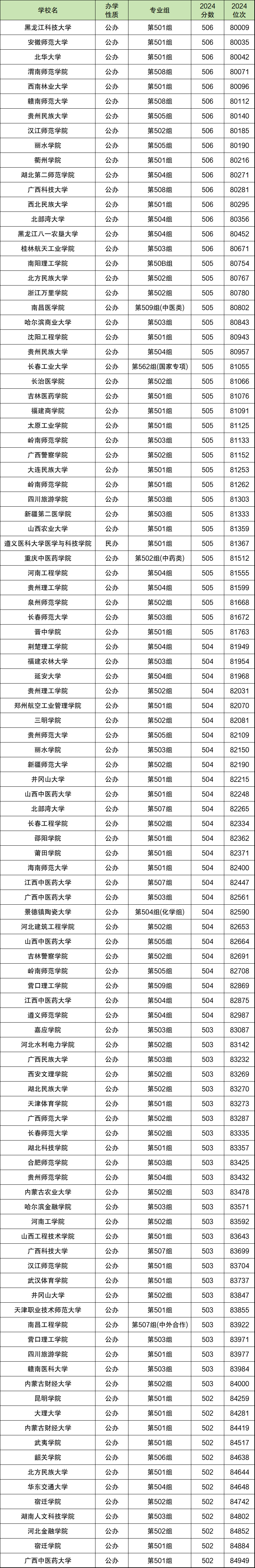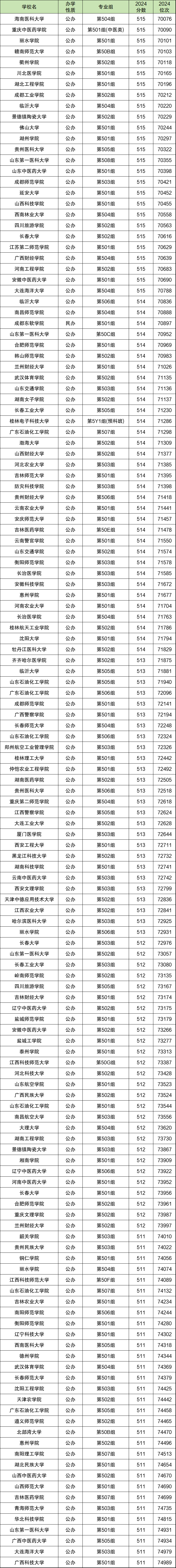 分数最高为海南医科大学504组,分数线是515分,对应位次为70076位。