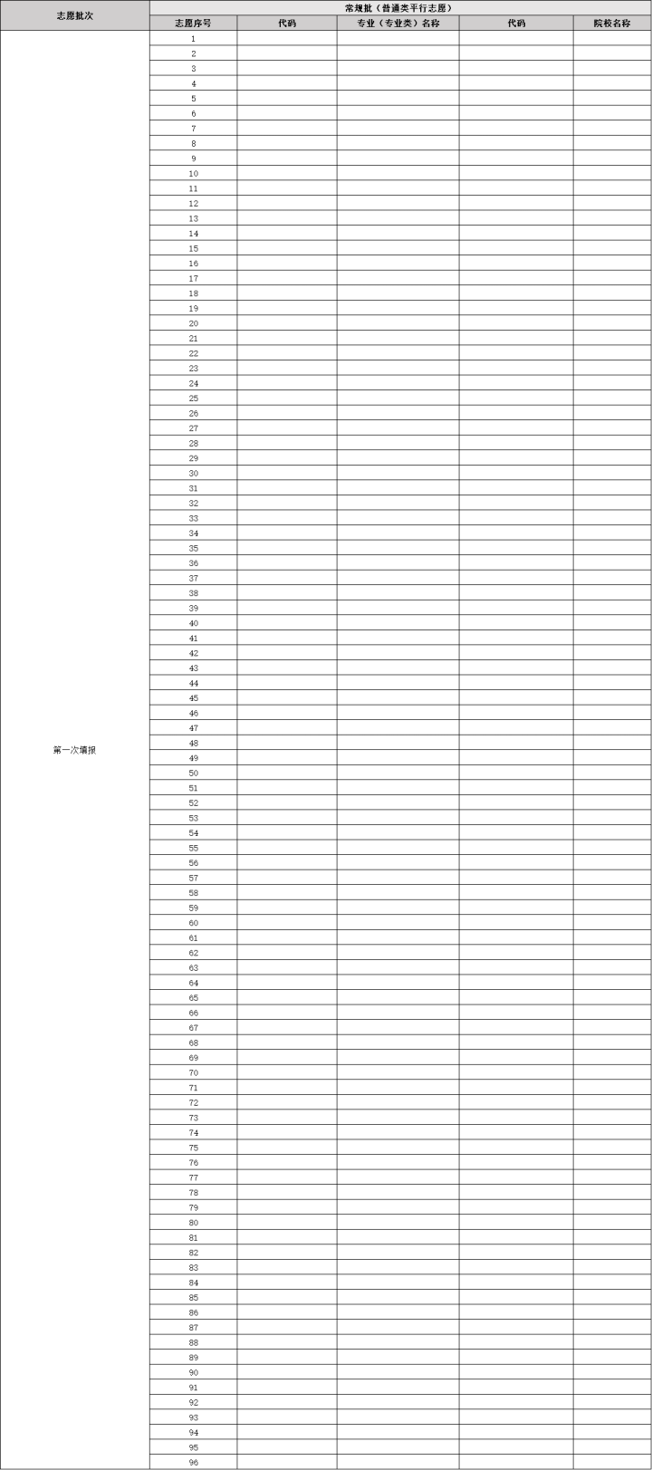 2024年山东省的常规批志愿数量均为96个,分三次填报,为帮助大家了解相关填报内容,这里附上其常规批第一次填报的志愿模拟样表,以供参考: