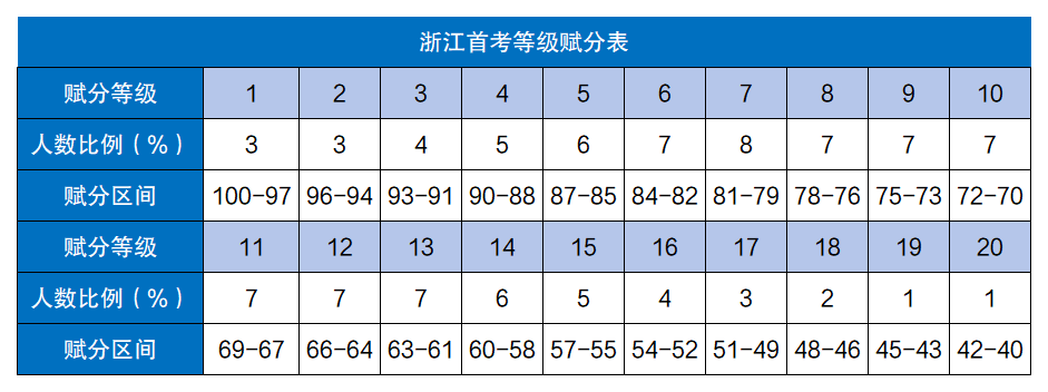 浙江采用的赋分等级表有20个区间,每个区间之间的分差为1分,赋分总分范围在40分~100分之间。也就是说,用这个赋分表计算成绩,考生最低也能有40分的保底分数,最高100分。