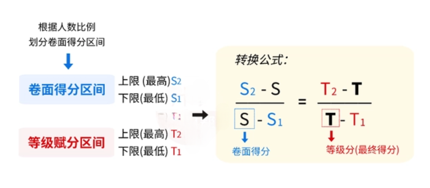 如上图所示,先用人数比例计算出各区间人数,再依照排名从高到低为区间划分考生,得出对应考生的卷面分上下限(即卷面最高分S2和卷面最低分S1)。