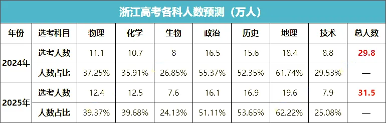以下是网传的浙江2024届、2025届高三各科目选科人数,可以看到物化捆绑后,化学科目的选科人数占比提升非常明显。
