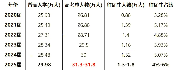 2025届学生,2022年全省普高入学人数29.98万,比上一年增加1.5万。根据目前了解到的部分高考报名情况,2025年高考报名的往届生并没有预测的那么多。考虑到不同学校和不同县市区的差异,若2025届往届占比在4%-6%区间,则复读考生人数在1.3-1.8万区间,2025年普通类高考的考生人数可能会在31.3-31.8万区间。