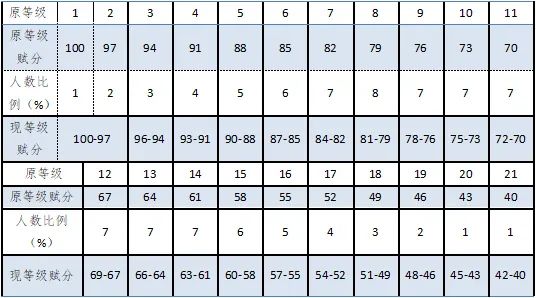 浙江高考赋分等级划分为20个赋分区间,赋分分差为1分,大家可以着重参考下表中“现等级赋分”一栏。