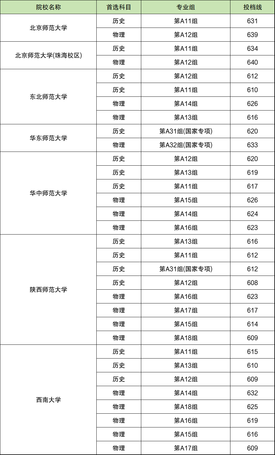 湖南国家公费师范生录取分数线是历史组最低608分,招生院校及专业组是陕西师范大学A12组;物理组最低609分,招生院校及专业组是陕西师范大学A18组、西南大学A17组。