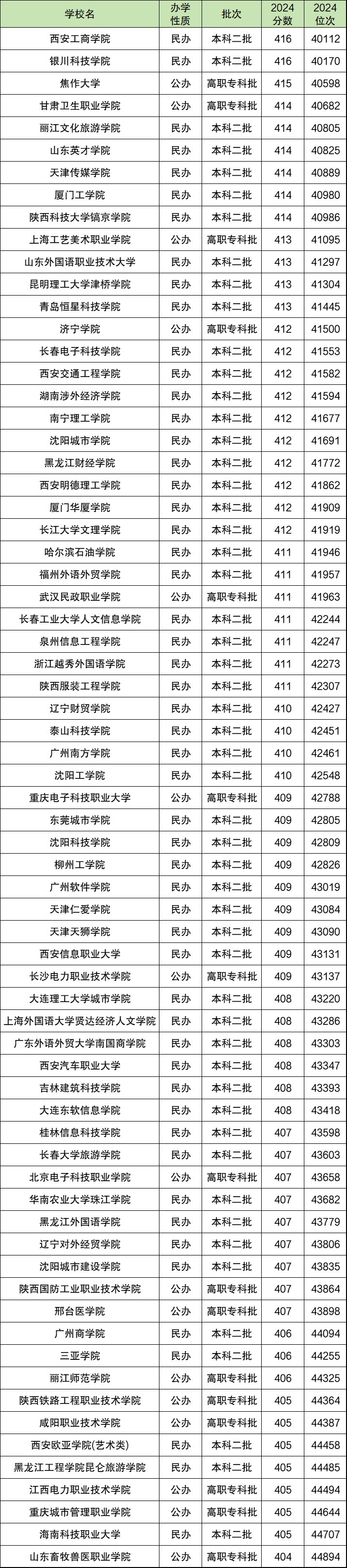在4万-4.5万位的范围内,最高位次对应的大学是西安工商学院,最低录取位次为40112位,位次对应分数为416分;