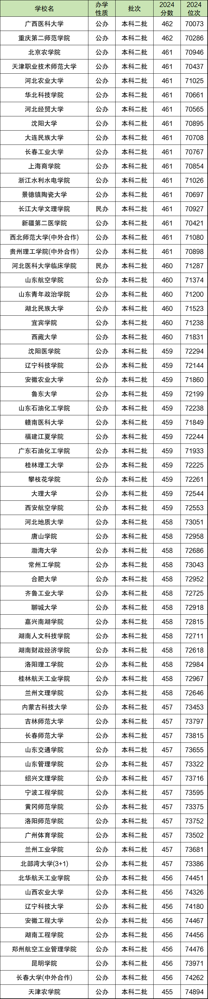 在7万-7.5万位的范围内,最高位次对应的大学是广西医科大学,最低录取位次为70073位,位次对应分数为462分;
