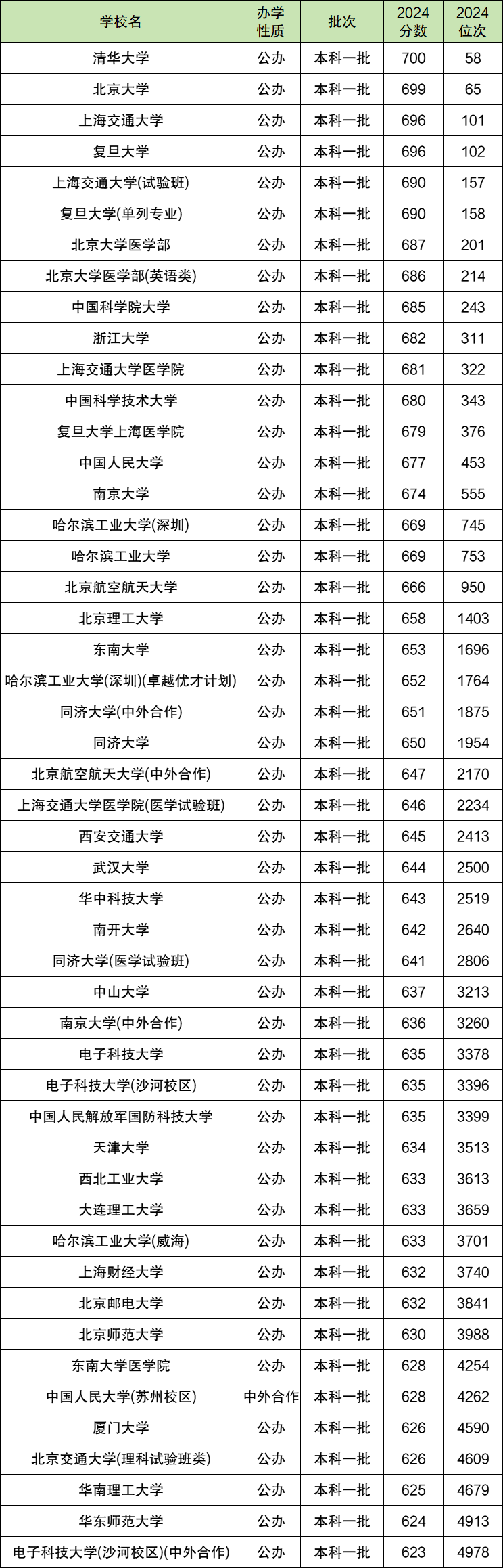 1-5000名中,最低排名对应的大学是电子科技大学(沙河校区)(中外合作),最低录取排名为4978位,排名对应分数为623分。