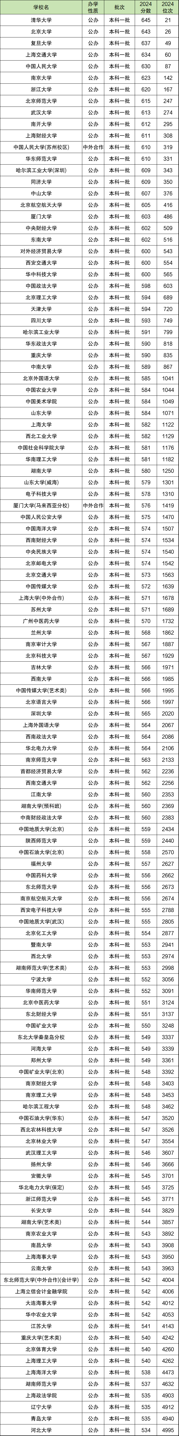 在1-5000名范围内,最高排名对应的大学是清华大学,最低录取排名为21位,排名对应分数为645分;
