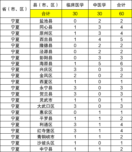 2024年宁夏定向医学生共招生60人,其中临床医学专业30人、中医学专业30人。招生人数最多的十个地区如下: